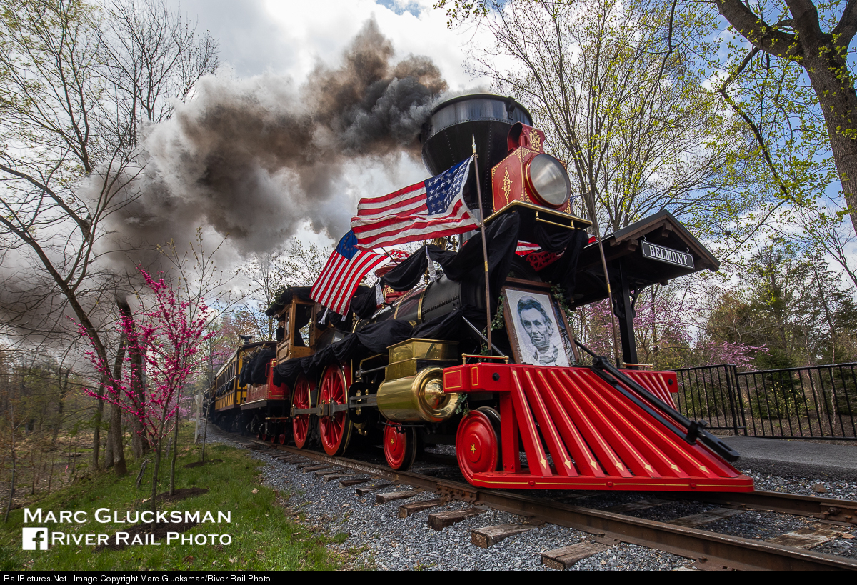 We're Thinking Of You Honest Abe. On April 22, 1865 at 12:05 PM, Abraham Lincoln's Funeral Train passed through Elizabethtown, Pennsylvania on the original right of way of the Pennsylvania Railroad. On April 22, 2021 at 12:05 PM, a reenactment was staged for the 156th Anniversary of the event at The Star Barn. "Leviathan" 4-4-0 331 (Kloke Locomotive Works of Elgin, Illinois, 2009, based upon the 1868 Baldwin design) stands in for PRR 331, hauling 3 cars including the Lincoln Funeral Car. This train operates when events are held at the venue. The train is seen passing "Belmont" under a full head of steam.