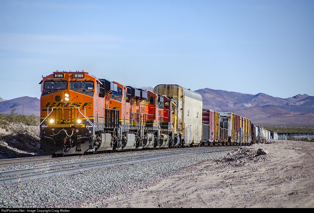The Bullion Mountains form a backdrop as BNSF train H-BELBAR1-12 makes its way from Belen, New Mexico, to Barstow, California. A quartet of contemporary General Electric diesels (ES44C4 8189, ES44DCS 7477 and 7521 and Dash 9-44CW 1073), along with EMD GP39-2 2844, are powering this train as it passes mile 705 on the railway’s Needles Sub as it crosses the Mojave Desert. (Pisgah, California – February 13, 2017)