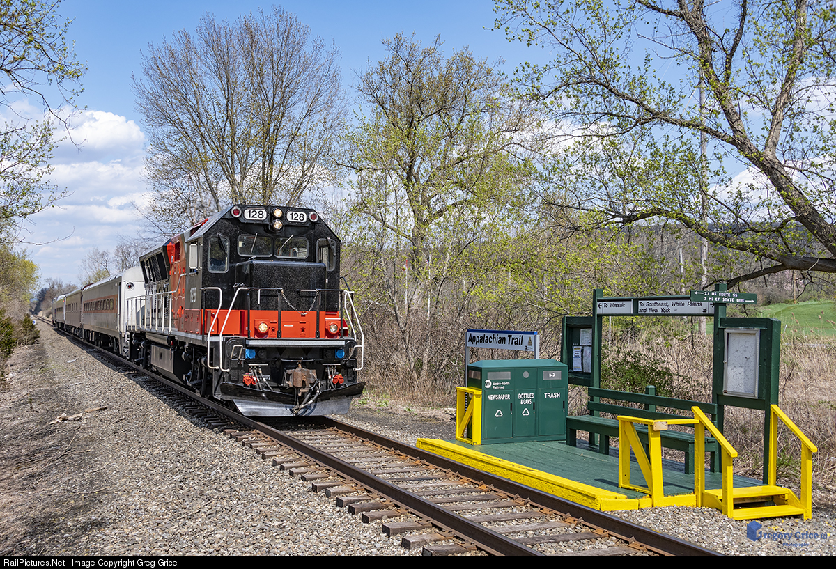 The Metro North/ Department of Transportation Geometry Train rushes past the tiny Appalachian Trail flag stop in Pawling, NY while heading south down the Harlem Line towards Grand Central Terminal.