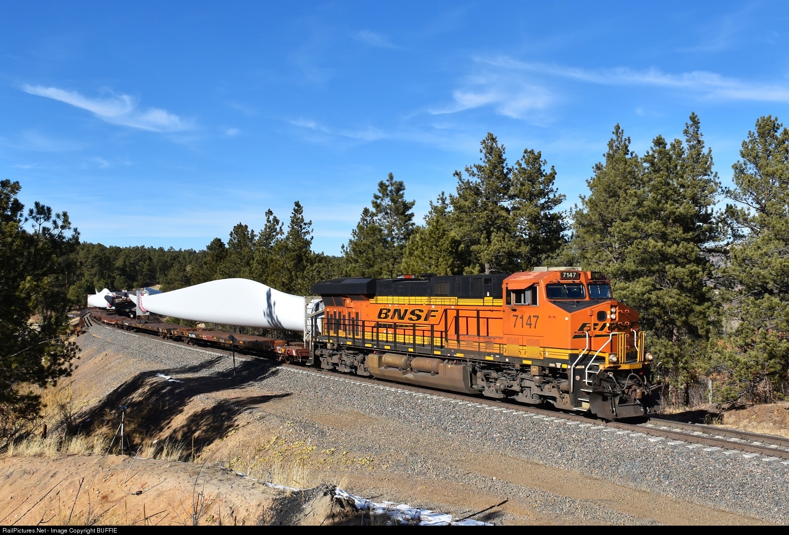 BNSF 7147 (ES44C4) leads a windmill blade train through the Black Forest in Larkspur, Colorado.