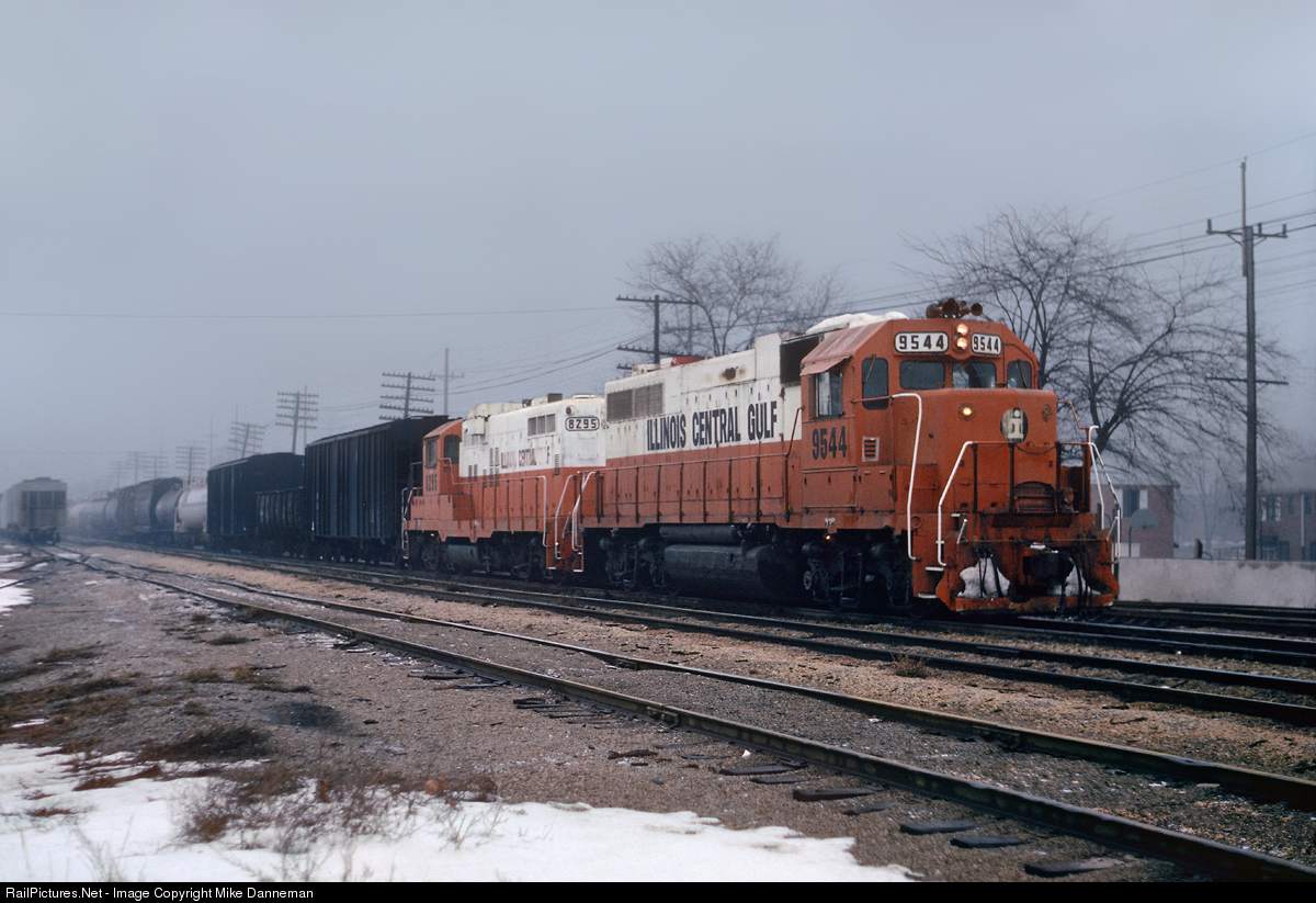 An Illinois Central Gulf freight train passes through Decatur, Illinois, on a very gloomy day in March of 1984. Both locomotives are painted in ICG’s orange and white paint scheme carried over from predecessor Illinois Central after the merger with Gulf, Mobile & Ohio in 1972.