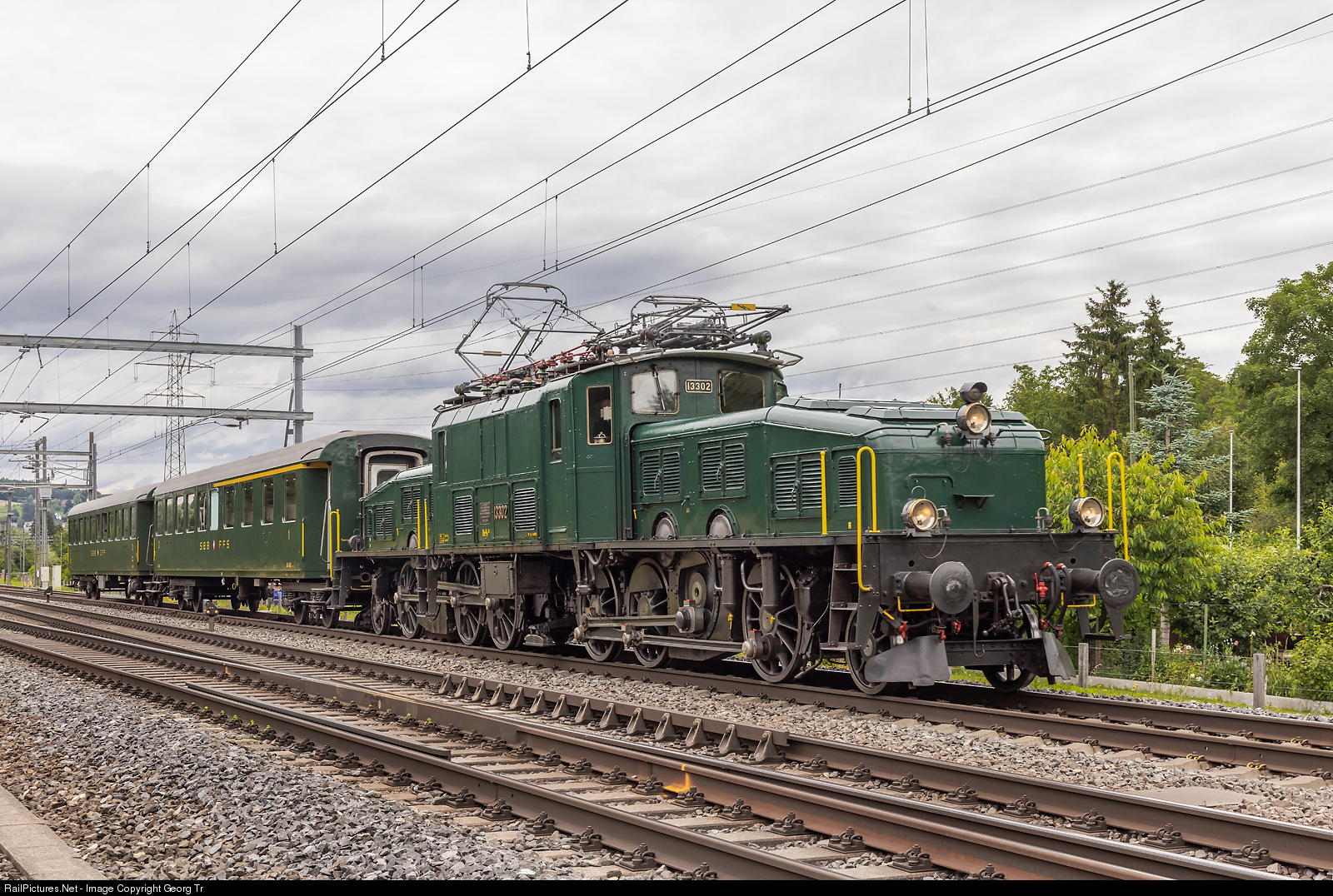 | "Crocodile" Be 6/8 III # 13302 of SBB Historic, loaned to and operated by "Betriebsgruppe 13302" in Rapperswil, is running with two empty "Railvetica" passenger cars (former SBB) from Winterthur to Effretikon in Winterthur Tössmühle. The locomotive was built in 1926 as Ce 6/8 III # 14302 by SLM and MFO and withdrawn in 1976. Since 1979 operational again as historic vehicle and based in Rapperswil. |