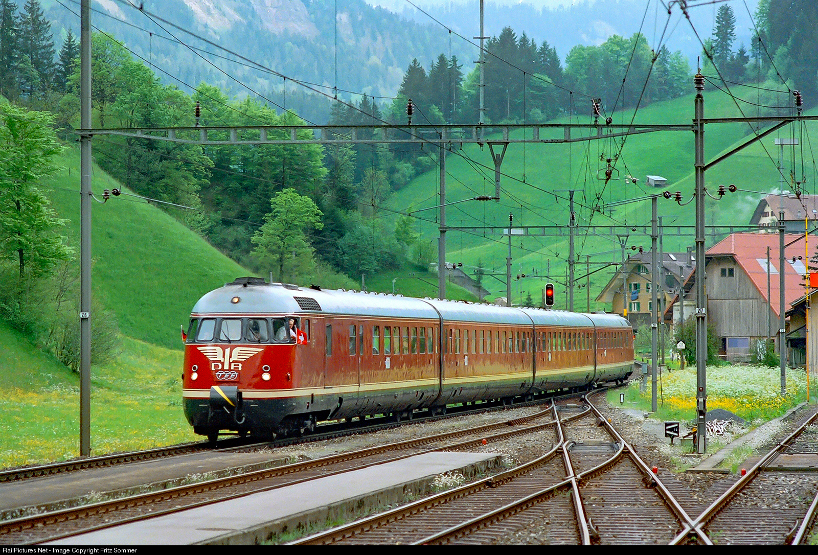 | On 23 May 1996, DB's "egghead" VT 08 passes through Wiggen station in the Entlebuch as special train 33059 on an excursion to Switzerland in rainy weather. Wiggen has been closed to passenger traffic since 2011 and the train is parked in Meinigen (D) in the open air in an inoperable condition.