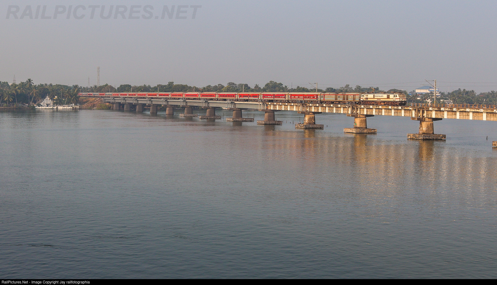 On a misty morning, ROYAPURAM WAP-7 leading Tirunelveli - Bilaspur Jn Express over Kaithapuzha lake towards ERNAKULAM Jn