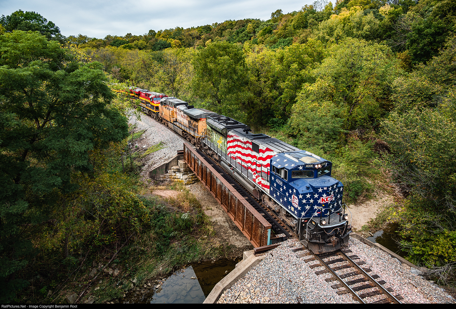 "Support Our Troops." KCS 4006 leads CN M338 over Catfish Creek in Dubuque.