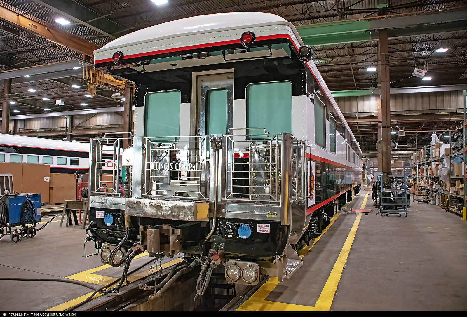 Canadian National (Illinois Central) business car IC 800413 Great Lakes is one of seven CN/IC business cars undergoing work at CN’s Woodcrest Locomotive Shops. This car, built by Pullman-Standard, is the former Illinois Central Gulf 1, originally Illinois Central 1 (built in March 1956). All seven of the cars in the shops this day were wearing this new red, white and black scheme. Note the stylish art deco "Illinois Central" roadname in the railing! (Homewood, Illinois – September 24, 2021) Photographed on railroad property with permission and full PPE and Covid precautions.
