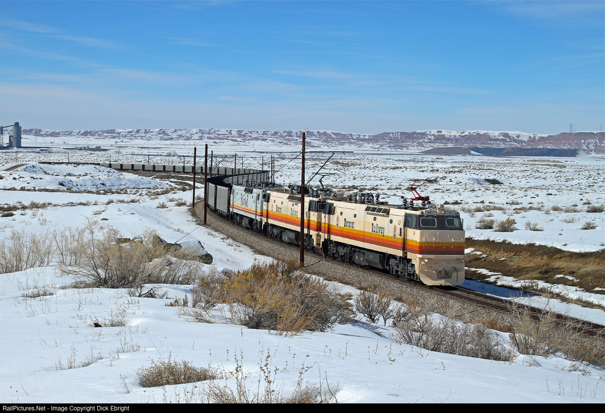 | This Deseret Ry. empty coal train is about 1 ½ miles from the end of the unloading loop at the Bonanza Power Plant. Ahead lies 32 miles of running across this stark, uninhabited and at this time of year snow covered landscape. Deseret Ry is the second name this railroad had painted on it’s locomotives. It started in January 1984 as the Deseret Western Ry. and kept this name until December 2001. In December 2001, the name was changed to Deseret Ry. by simply painting over the word Western on the side of these E60’s. Deseret Ry. lasted until July 2011 when the entire fleet of 4 E60’s was completely repainted with a new name; Deseret Power Ry. which remains to this day. The trailing National of Mexico grey unit remained un-repainted from its acquisition until the general fleet repainting in 2011. These units are kept clean and in immaculate condition to this day. |