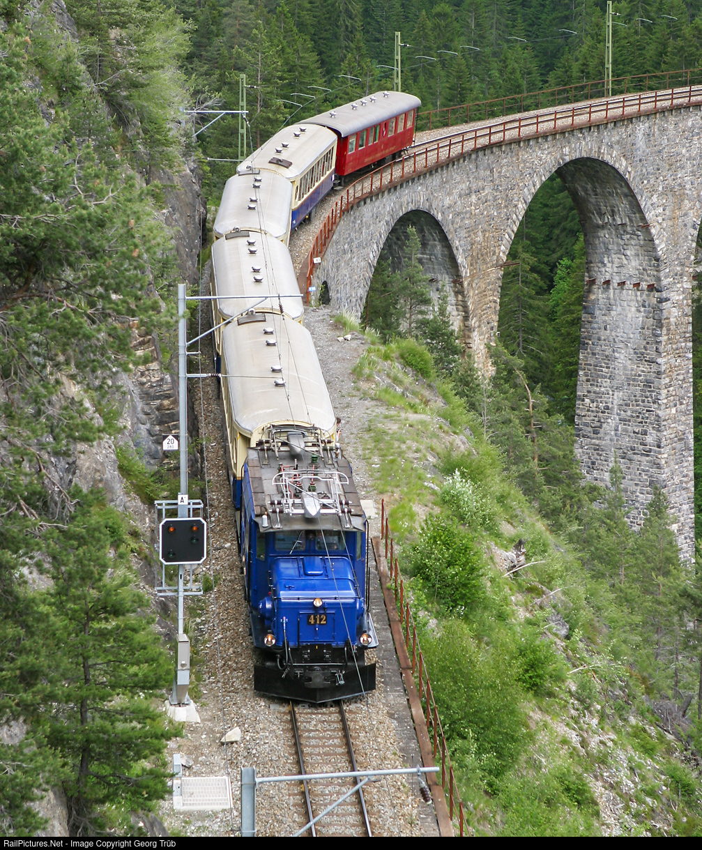Ge 6/6 I # 412 of the Rhaetian Railway in the blue paint scheme is pulling the Alpine Classic Pullman Express (ACPE) over the Landwasser viaduct between Filisur and Alvaneu. The red parlor car AB # 2121 in the rear, then owned by the Brig-Visp-Zermatt Bahn, is now beautifully rebuilt by the Aarau workshop as AB # 4421 with the Dampfbahn Furka Bergstrecke (DFB). The blue locomotive Ge 6/6 I # 412 was withdrawn after a heavy gear damage in 2008 and scrapped, sadly.