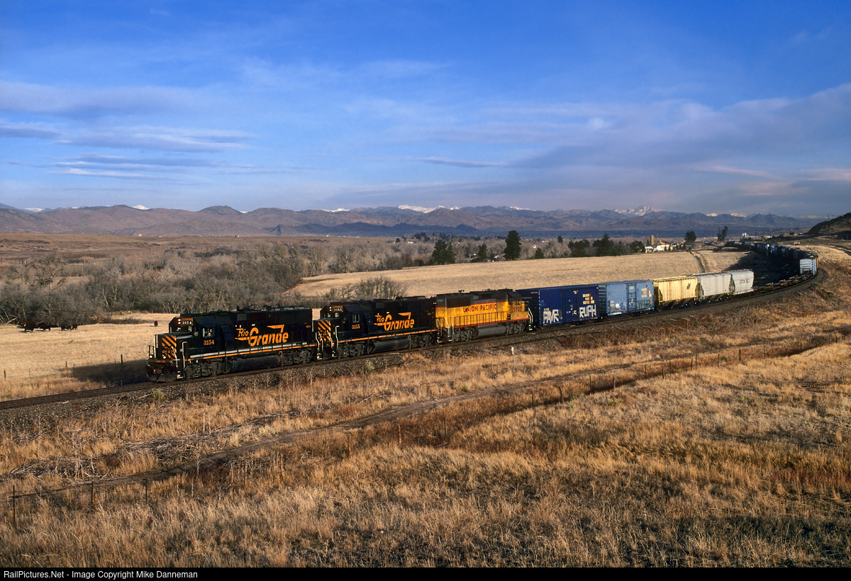 All three of Rio Grande’s EMD GP60s, D&RGW No. 3154, D&RGW No. 3155 and—dang it—Union Pacific just repainted and renumbered D&RGW No. 3156 into a yellow No. 5702, power UP’s Denver to Pueblo freight through Sedalia on Colorado’s Joint Line the morning of February 25, 1999.