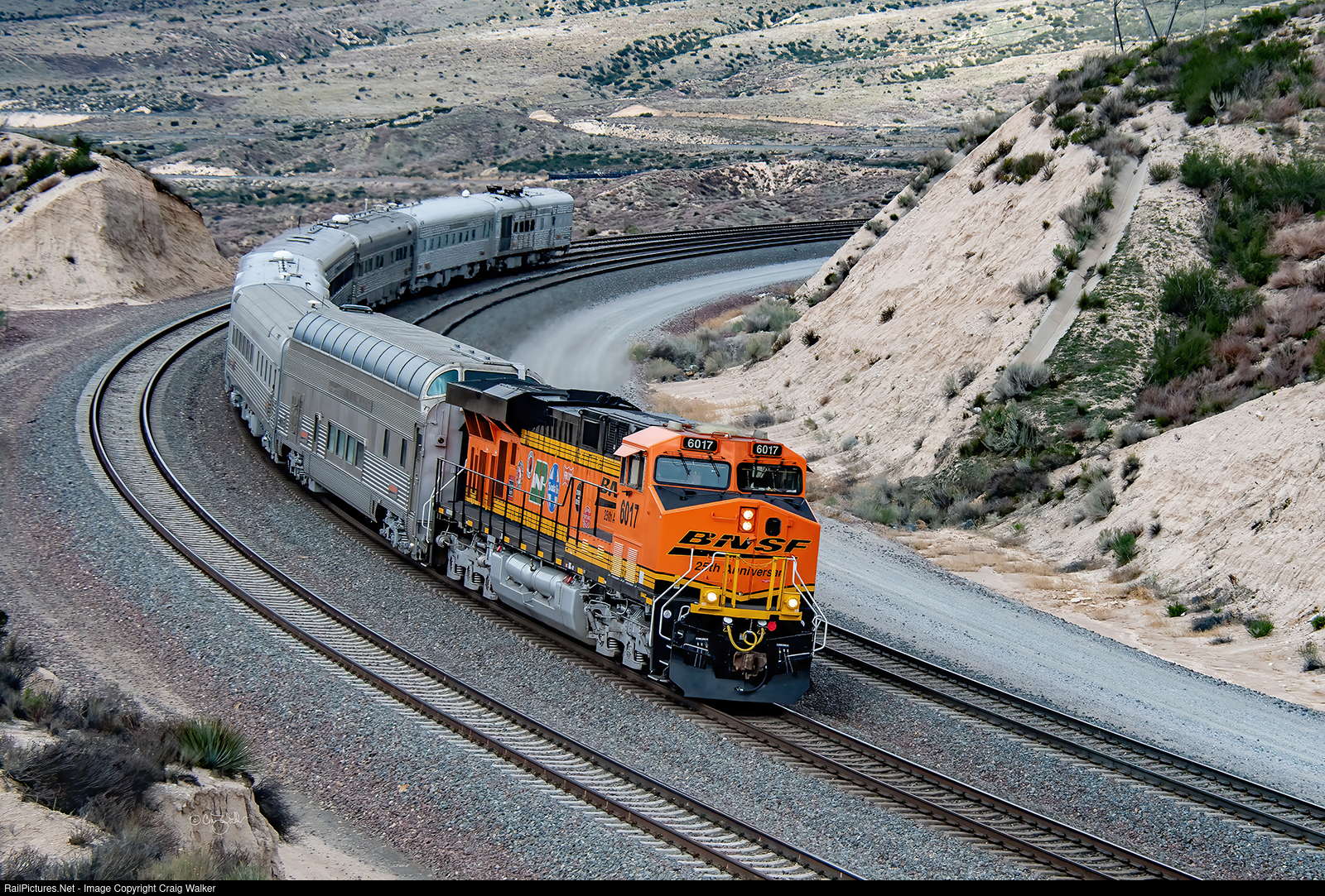 BNSF Railway train O-SBDTOP1-23, powered by Anniversary ES44AC 6017 (1/10th of the fleet of BNSF Anniversary engines), is about to crest the Summit of Cajon Pass as it heads back to Topeka after spending 27 or so days in southern California. This truncated version of the train that arrived on January 27th departed nearby San Bernardino and is taking its cars back to the shop for cleaning, maintenance and removal of all the "foam" they were subjected to by railfans in the southland for all this time. (Cajon Pass, California – February 23, 2022)