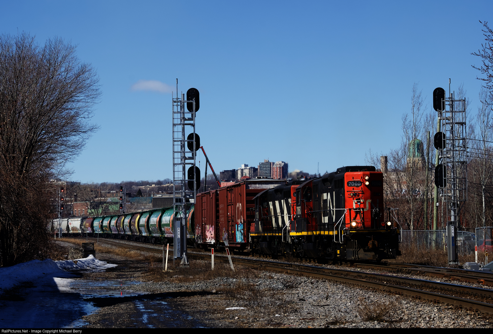 | GP9s CN 7060 & CN 4140 are leading about thirty cars that had been parked towards Pointe St-Charles Yard, including a cut of GWRS hoppers in the green Saskatchewan paint scheme. |
