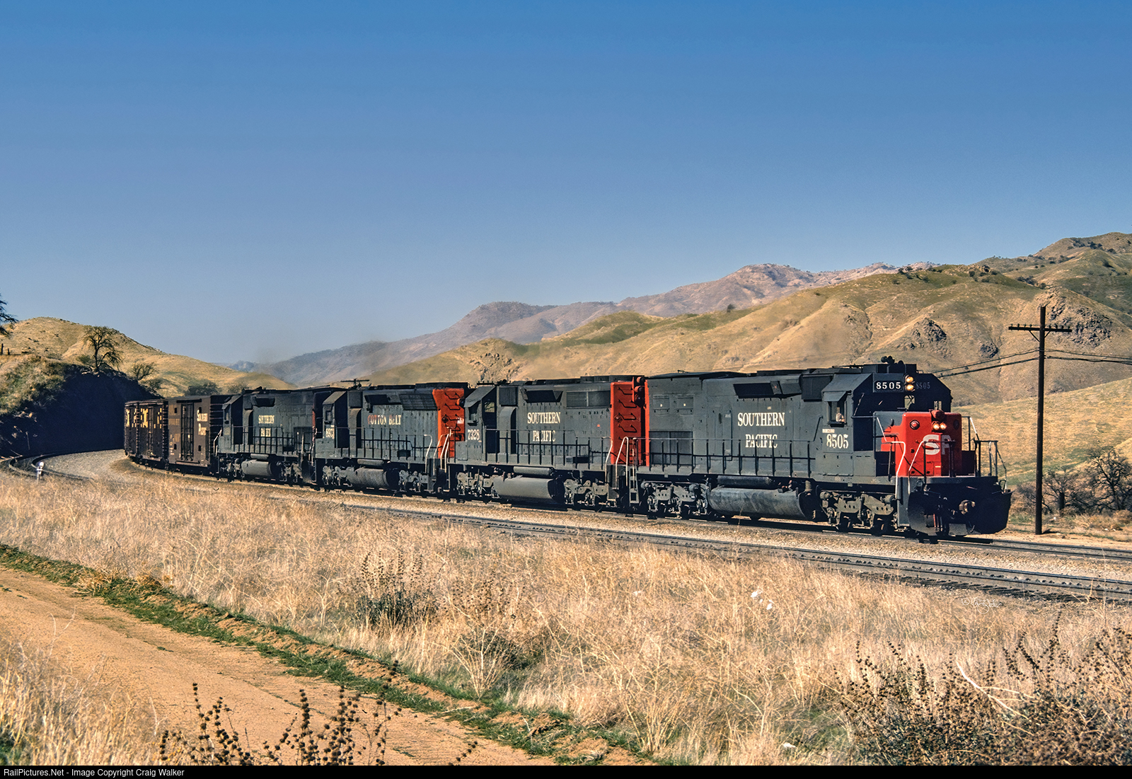 Climbing out of California’s San Joaquin Valley is a Southern Pacific freight with SP SD40T-2 8505, SP SD40 7328, Cotton Belt SD45 8973 and an SD45T-2 providing the muscle to defy gravity and get this train up and over the Tehachapi Mountains. (Bealville, California – February 21, 1981)