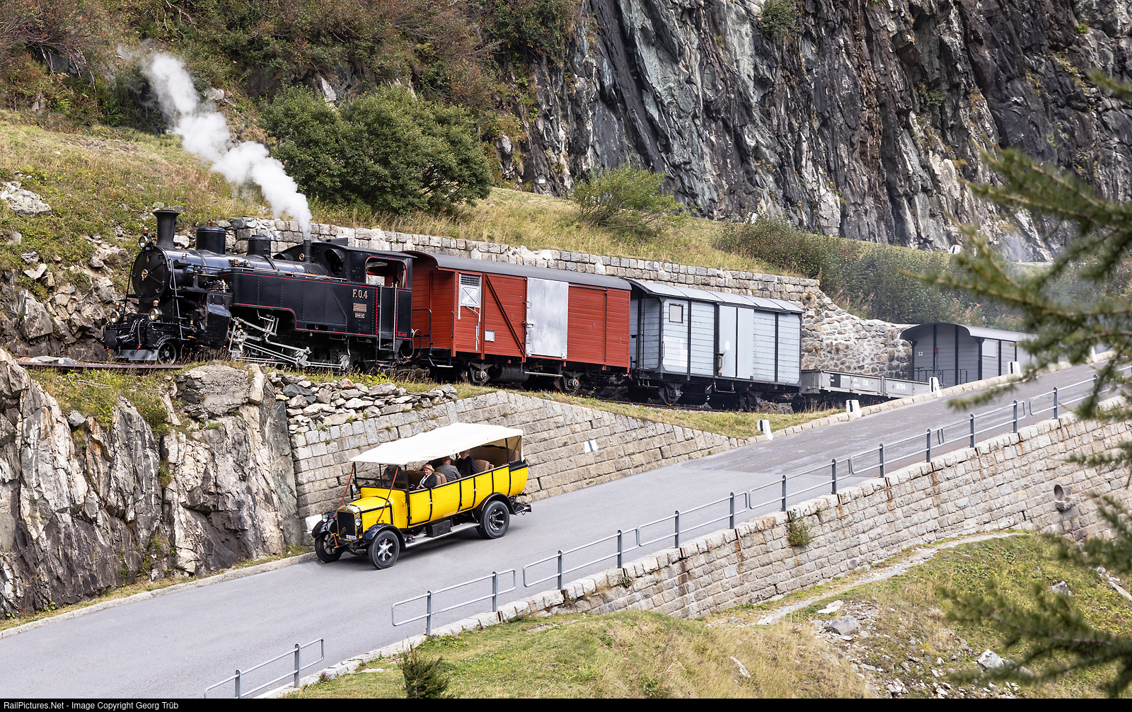 | Re-enactment scene of the Furka-Oberalp-Bahn near Gletsch in the 1930/1940' during a P.M. photo event, with HG 3/4 # 4 leaving the Gletsch spiral tunnel in a grade of 11.0 % with a freight train, while the post bus "FBW" type "F1" (Franz Brozincevic Wetzikon) of 1925 (reconstructed 1993 to 1995 by Seitz/Hess for Willi Roellin/Wollerau) is running down to Oberwald. |