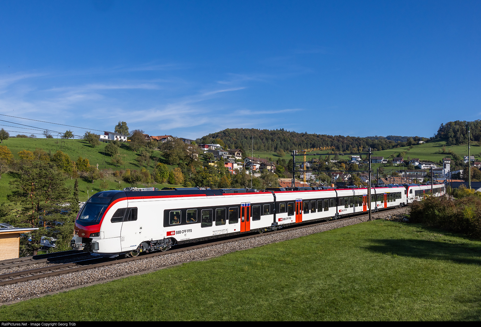 Three coupled new "Mouette" (seagull) Flirts RABe 523 # 508, # 503 and # 506 of the SBB in multiple control are running the "Flugzug" IR 2076 from Zürich Airport via Zürich main station-Baden-Brugg-Frick to Basel, on the Bözberg line near Zeihen, between Effingen and Hornussen. This new trains from StadlerRail are in service since the day before.