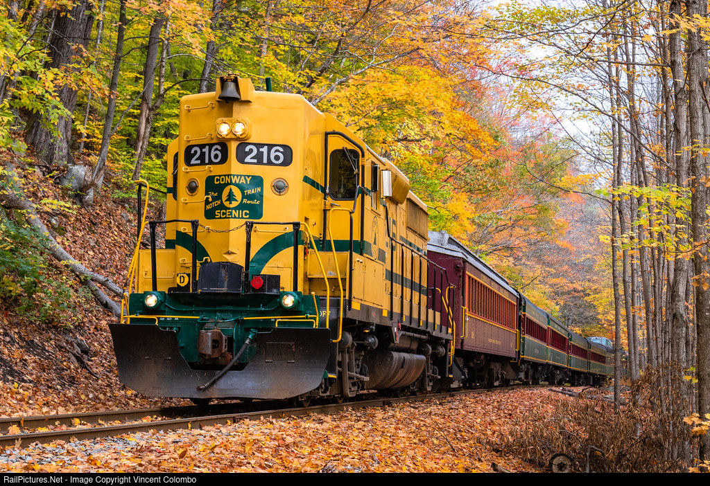 | Conway 216 is on the tail-end of a 470 Railroad Club special in Hart's Location, between Arethusa Falls Road and the Frankenstein Bridge. Conway Scenic 573 and 4266 are leading the train up the mountain en route to Quebec Junction. |
