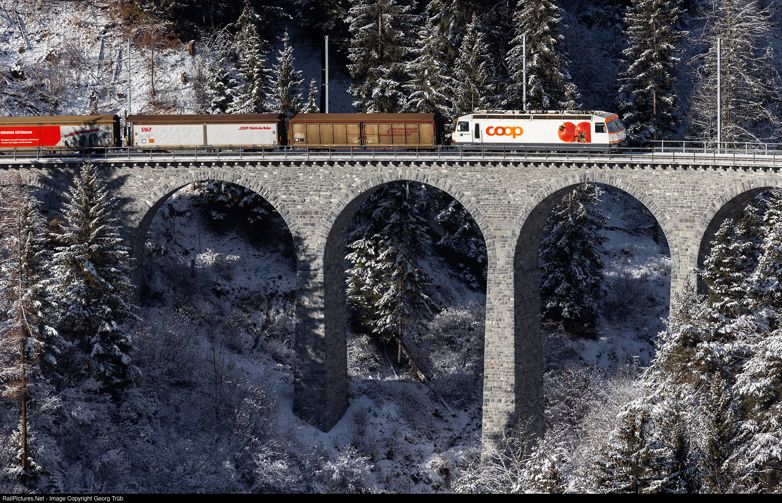 Ge 4/4 III # 641 "Maienfeld" of the Rhaetian Railway, in the Coop (large swiss retailer) publicity paint scheme, is crossing the 35 meter high Schmittentobel viaduct between Alvaneu and Filisur with the freight train 5129 from Landquart freight yard to Samedan. Behind the locomotive is sliding doors car Haik-v # 5116, built in 1970 already and one of the oldest operational of this type. Second is Haikqq-y # 5167 of 1980.