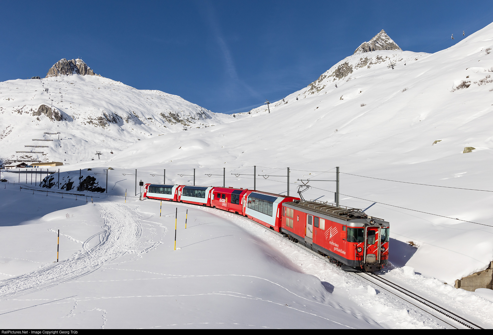 Due to high demand, between December 26, 2022 and January 2, 2023, an additional GLACIER EXPRESS will run between Zermatt and St.Moritz in each direction. Between Zermatt and Disentis and vice versa the trains were hauled by the baggage railcar Deh 4/4 # 23 "Randa" of the former Brig-Visp-Zermatt-Bahn BVZ. This 1074 kW rack railcar was built in 1976 by SLM, SIG and SAAS. Train PE 92904 from Zermatt to St.Moritz is running between Oberalppass and Tschamut-Selva. In the background are Schneehüenerstock (2772 meter a.s.l.) on the left and Piz Tiarms (2917 m) on the right.