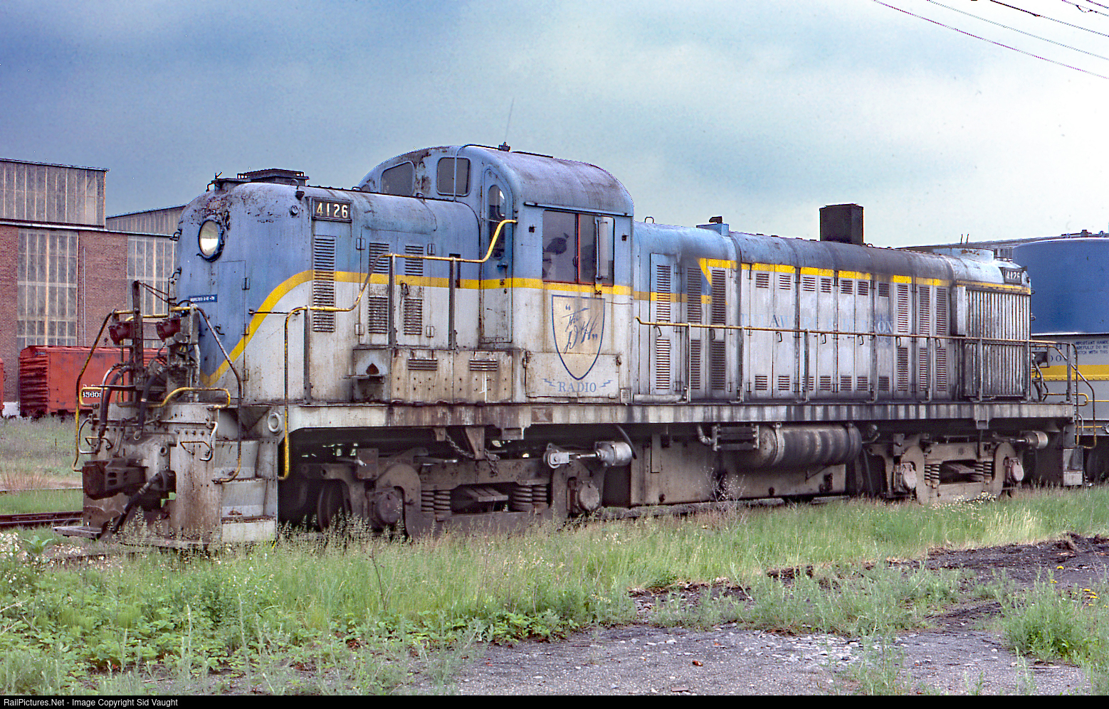 Looking forlorn at the shops, this unit was later painted up and kept going. I wonder why they chose that old-style headlight in the era of sealed beams. Lots of 32 volt bulbs on hand I guess, LOL. Note the weather. If NY needs rain just call me for a railfan trip, any time of year.
