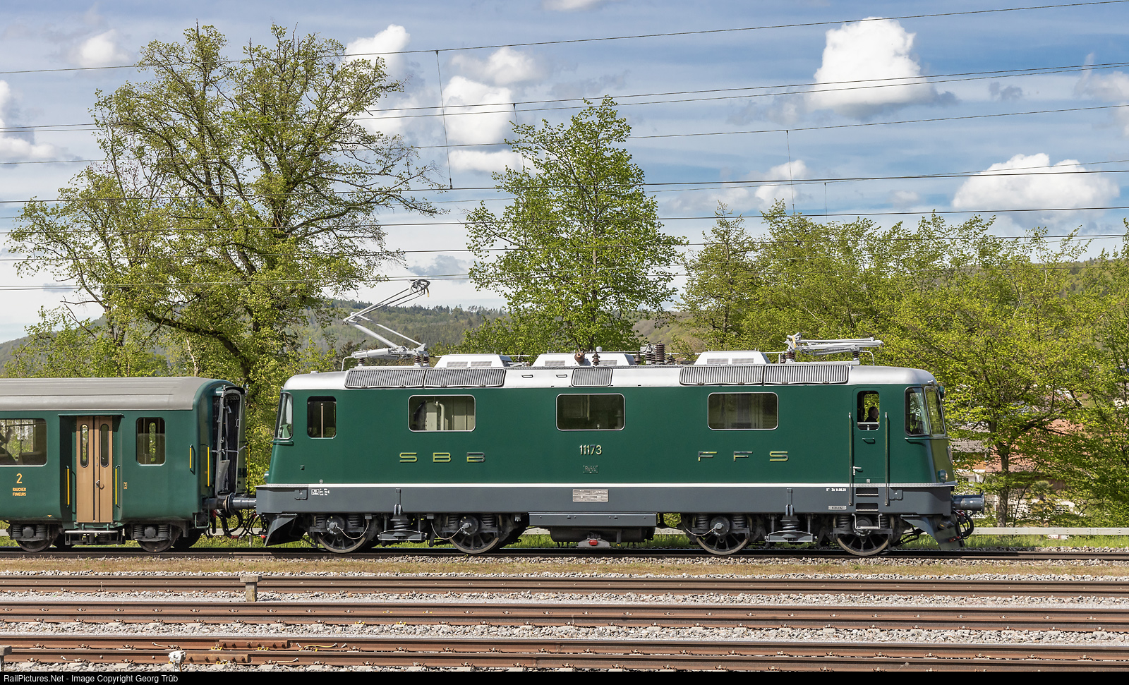 | For television recordings for SWR Eisenbahn-Romantik, extra trains ran exclusively with green rolling stock as was common at SBB decades ago. The locomotive Re 4/4 II # 11173 pulled the second class standard cars type I B # 50 85 20-33 654-8 and B # 50 85 20-35 362-6 (former GFM/TPF), the first class standard car type I A # 50 85 18-33 524-7 and the baggage car D # 50 85 92-33 116-1. All vehicles (exept B # 362) were formerly owned by SBB and now belong to the association DSF (Depot und Schienenfahrzeuge Koblenz). Train 32083 from Bad Zurzach to Eglisau passes through Rekingen station. |