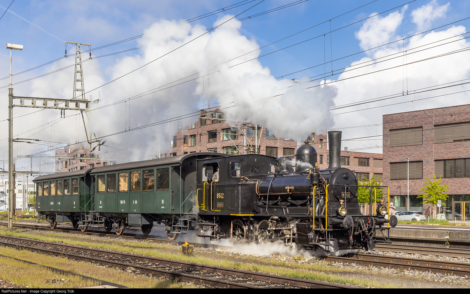 The former SBB "Tigerli" steam shunting locomotive E 3/3 # 8512, now owned and operated by association steam group Zürich (VDZ Verein Dampfgruppe Zürich), is in Rheinfelden on the occasion of the beer festivity of the Feldschlösschen brewery. The cars are third class C # 69 and # 68 of the Zürcher Museumsbahn (ZMB), built in 1927 for the Sihltalbahn.