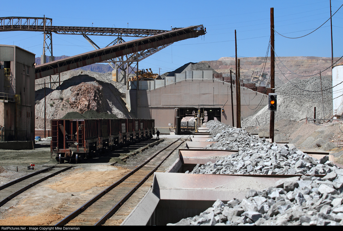 Copper Basin Railway’s OT-1 ore shuttle train is loading ore at Asarco’s massive Ray copper mine in a view from the cab of CBRY EMD GP39 No. 505 on April 20, 2017. On the left are unique hopper cars that are loaded with copper concentrate. What look like traffic signals displaying yellow are to let the CBRY crew know they are to go at loading speed and the ore loading chute is functioning as intended. The signals will show green as the train approaches to let the CBRY crew know that the loader is ready load, and displays red when the loading operator needs the train to stop for any reason during the loading process.