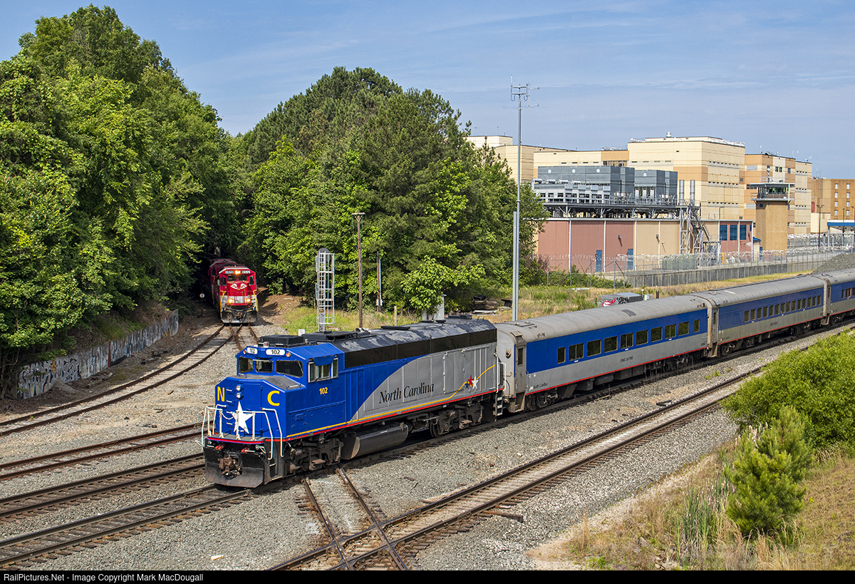 Amtrak 75 departs Raleigh for Charlotte with NCDOT Cab Control Unit 102 on the rear while Raleigh & Fayetteville RF01 waits for their turn across the diamond at Boylan with an RJ Corman B39-8 leading the train of interchange traffic for NS at Glenwood Yard.