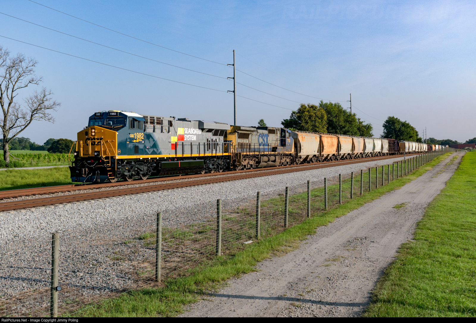 | The newly painted Seaboard System heritage unit, CSX 1982, leads Tampa bound manifest M441 through Richland on the CSX Wildwood Subdivision.