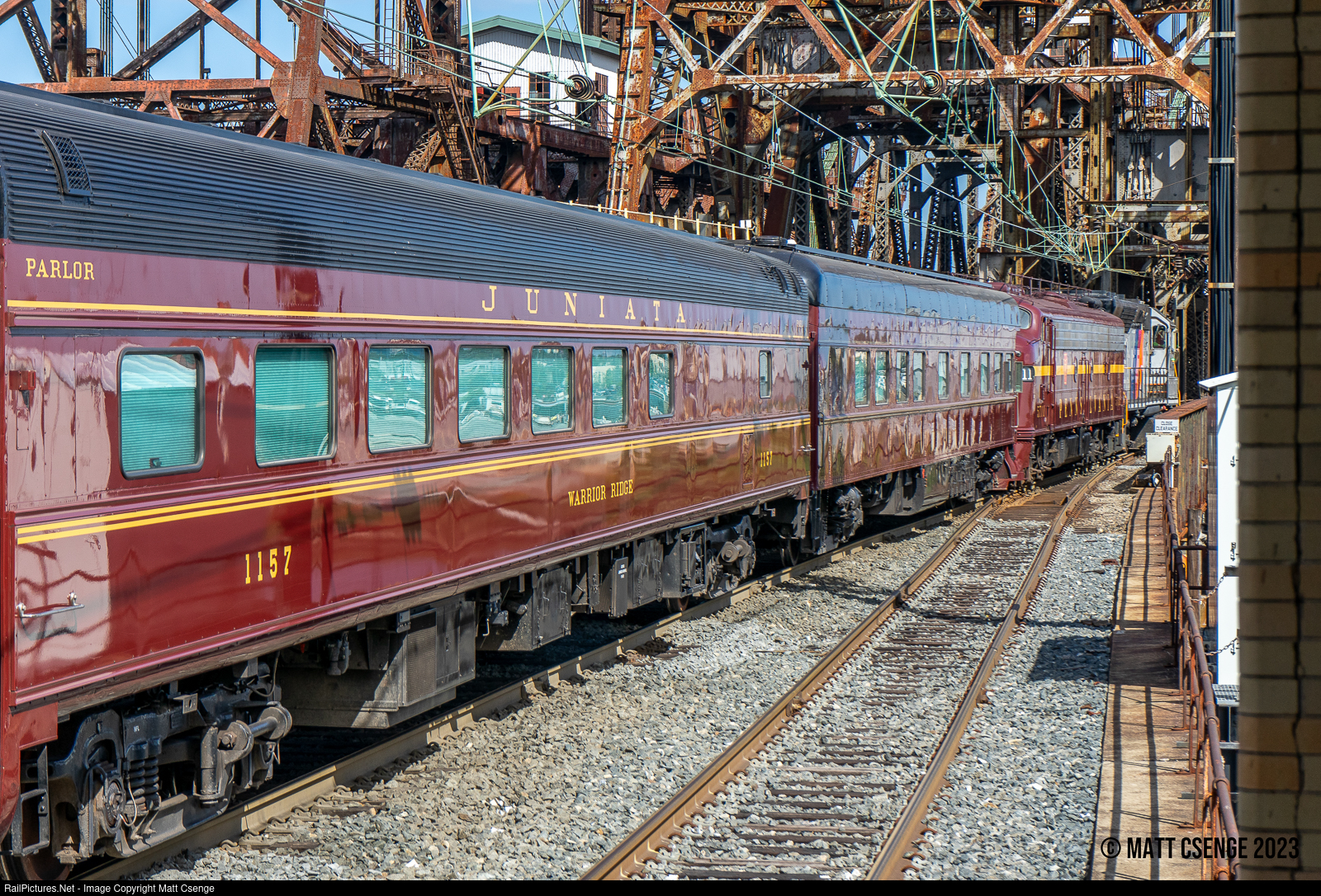 Juniata Terminal Co. parlor car no. 1157 Warrior Ridge, observation car no. 120, and E8 no. 5711 are seen north of Newark Penn Station, hauled by NJ Transit GP40PH-2 no. 4108. The equipment is headed to the Meadows Maintenance Complex in preparation for NJ Transit's 40th anniversary events this weekend, which will include an excursion on the North Jersey Coast Line and a public display of heritage equipment at Hoboken Terminal.
