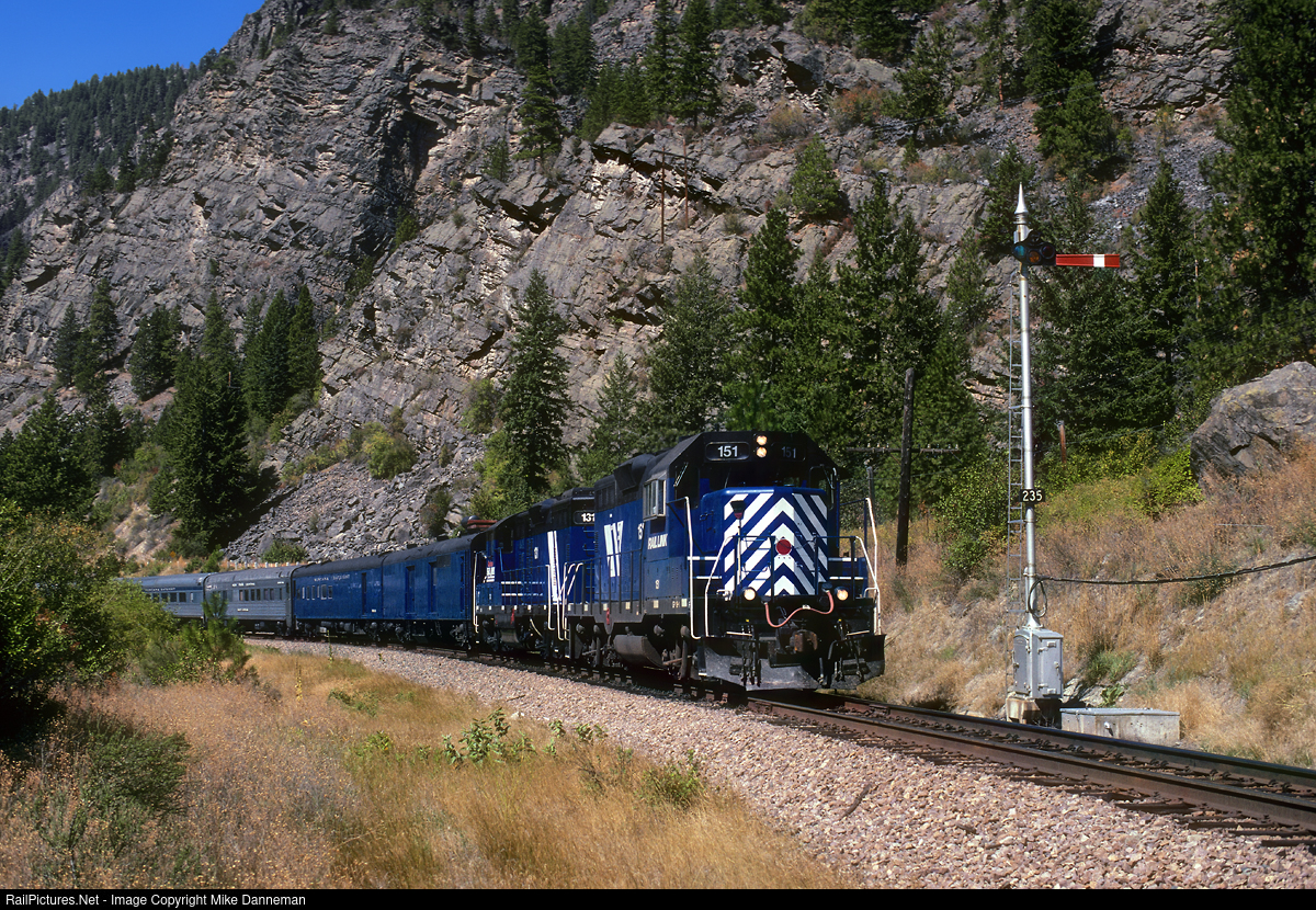 Montana Daylight For several years, Montana Rail Link operated a passenger train on portions of its scenic routes called the “Montana Rockies Daylight,” commonly called “Montana Daylight,” operated by Montana Rockies Rail Tours. In this view, the eastbound train passes the mile 23.5 semaphore west of Eddy, Montana, on September 10, 1999. The lead locomotive is unique EMD GP19-1 No. 151 rebuilt by MRL from a former Northern Pacific GP9. This one-of-a-kind locomotive was involved in a switching accident and scrapped in 2008. The passenger train itself didn’t fare much better, discontinued after the 2004 season.