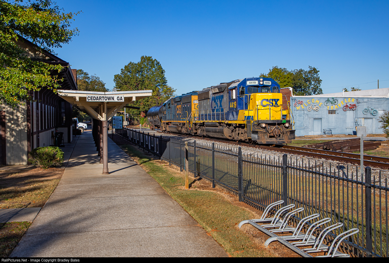 | CSXT GP40-2 #4419 still wearing it's YN2 paint scheme leads local L810-17 back to Cartersville as they pass by the Welcome Center in Cedartown, GA. The Welcome Center was built in 2004 as a replica of the Seaboard Air Line Railway depot. |