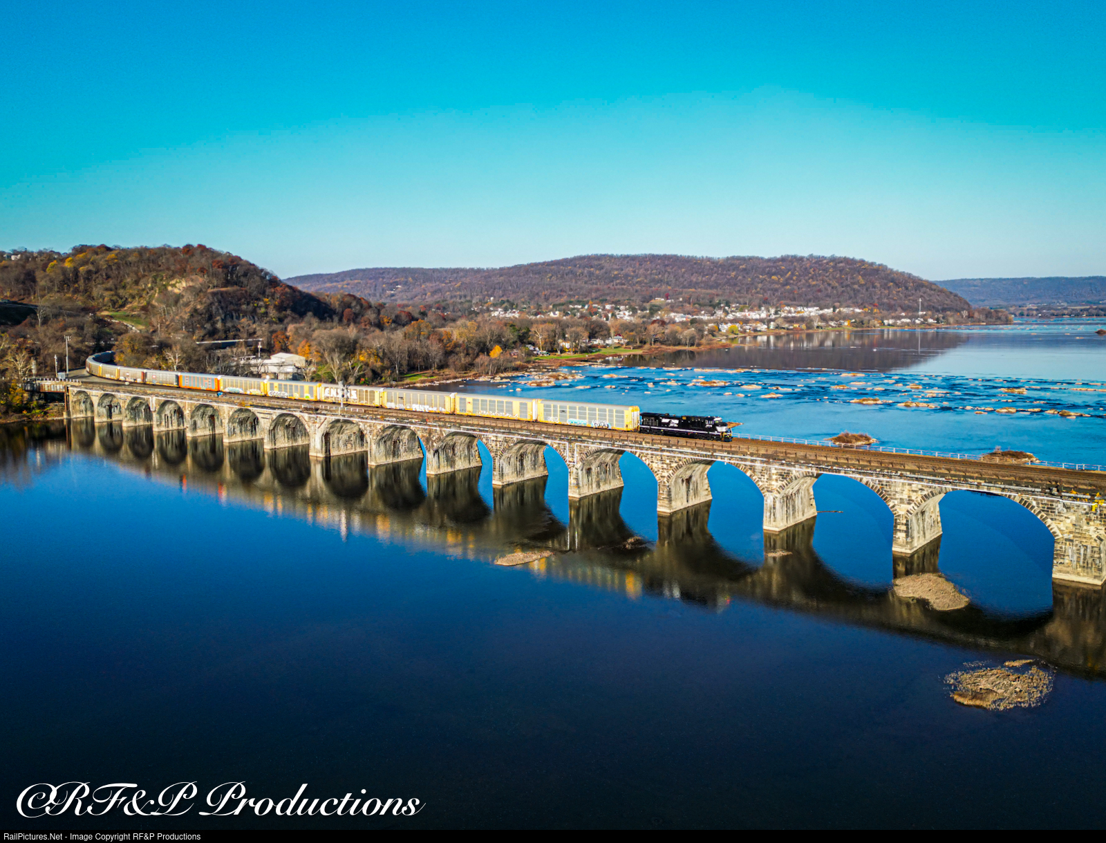 | For Our Troubles: After a long and challenging trip in the early morning darkness to get to Harrisburg, we finally made it to the iconic Rockville Bridge in time to see the 18N being solo led by a fresh C6M as they head into the capitol city. |