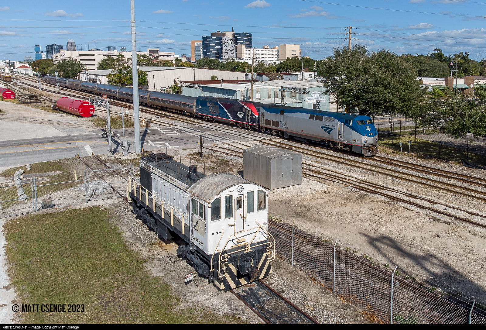 Snowbirds. Amtrak P42DC no. 152 (GE Genesis, 1992-2001) and SC-44 no. 336 (Siemens Charger, 2016-present) are seen leading train 97(22), the southbound Silver Meteor, across W Kaley St after departing Orlando Station moments before. The train is passing the Conrad Yelvington facility south of the station, where S-2 no. 224 is laid up on a spur track. The unit was one of a batch of 49 S-2's built by ALCO for the Chesapeake & Ohio (C&O) in 1949 and 1950. Now it spends its days working alongside an RS1 and a SW9 at the aggregate distributor's yard.
