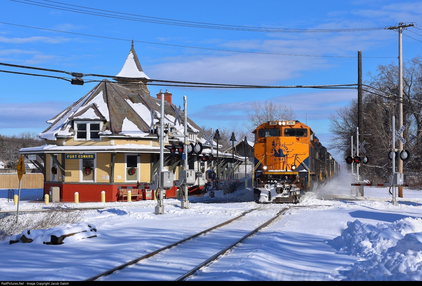 Norfolk Southern’s CNJ Heritage SD70ACe leads train 928 past the former D&H station in Fort Edward. Snow had fallen the day before making for this perfect winter scene complete with wreaths in the windows.