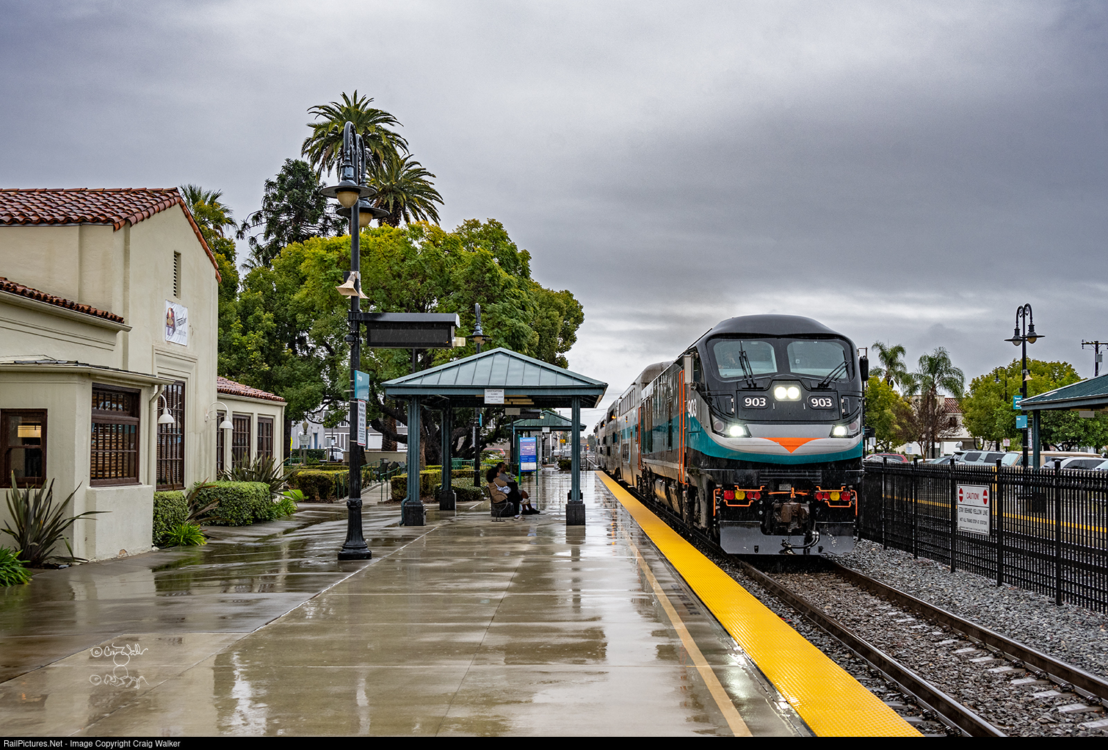 Another atmospheric river hits California, but this one isn’t as bad as the one earlier in the month. Metrolink train 802, behind F125 903, rolls to a stop at the station (a former Santa Fe depot) in Orange, which also doubles as the Streamliner Café! This four-car train is making its way from Laguna Niguel/Mission Viejo to downtown San Bernardino. (Orange, California – February 20, 2024)