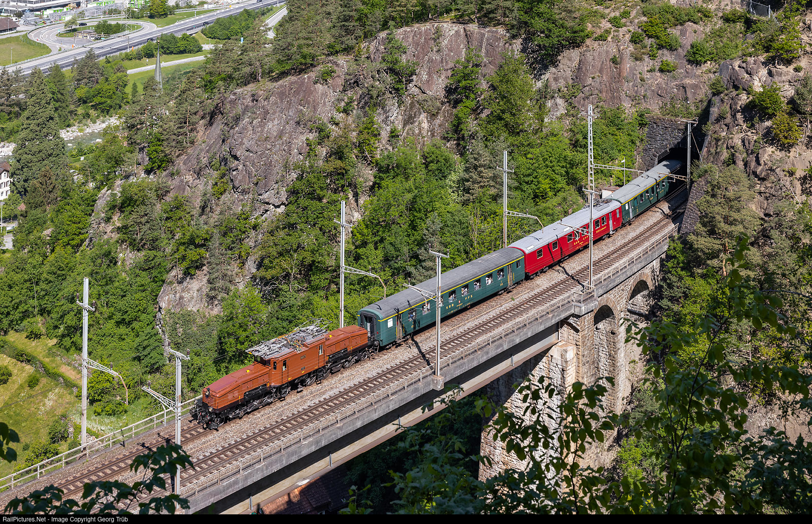 | The "Gotthard Adventure Train" 31401 of SBB Historic from Erstfeld over the Gotthard mountain line to Lavorgo is crossing the 127 meter long and 53 meter high Chärstelenbach bridge between Amsteg-Silenen and Gurtnellen. The bridge in its current form with two solid-wall steel girders and a concrete deck dates from 1970/1972. The Gotthard Adventure Train runs 7 times between April and October, on the second Saturday of each month, either with the "Crocodile" Ce 6/8 II # 14253 or the "Gotthard Locomotive" Ae 6/6 # 11411 "Zug". |