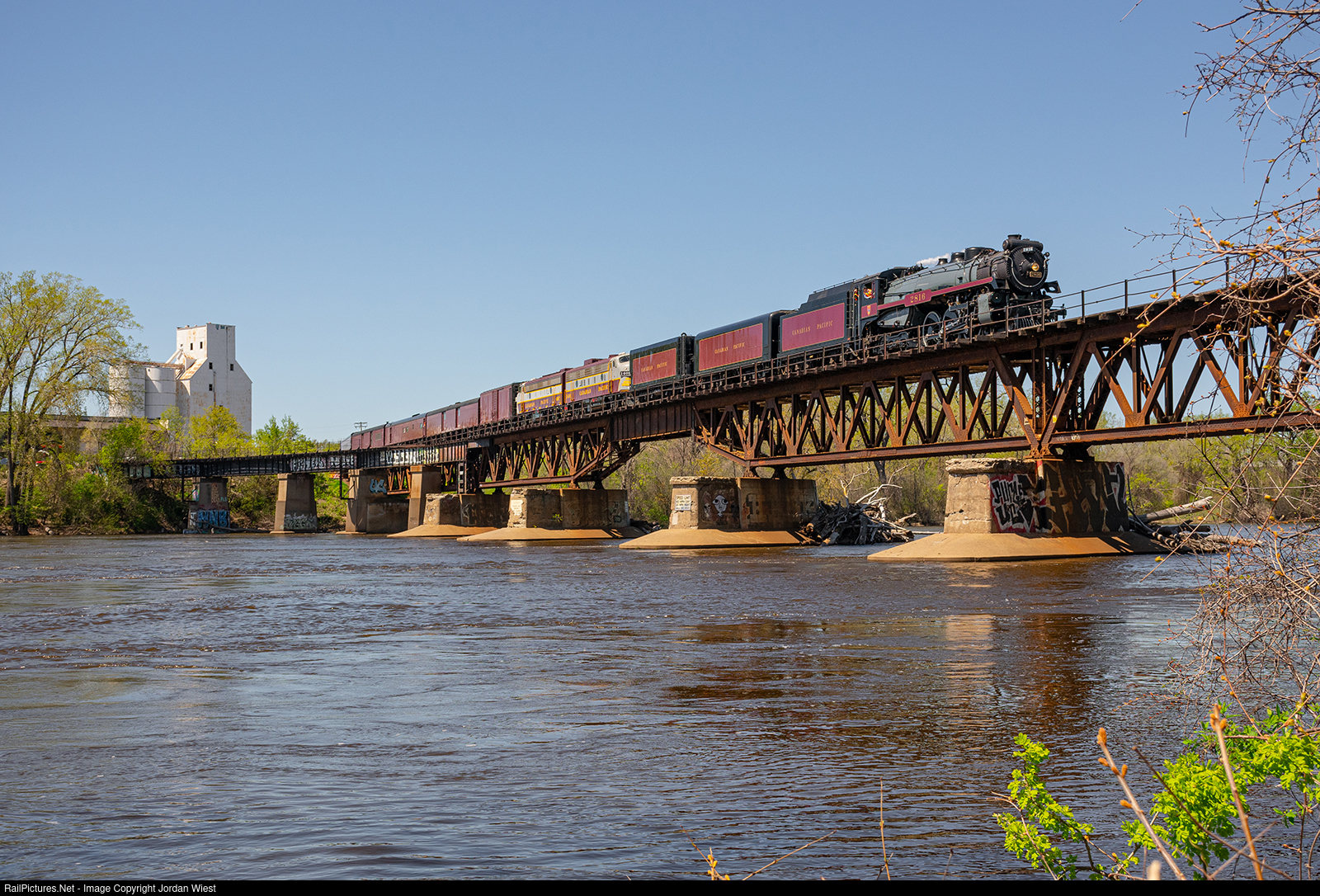 | After overnighting in Humboldt Yard, CP 2816 is on the move once again, making its way east over the Mississippi River at Camden. The train is heading to St. Paul for a public display at Union Depot. |