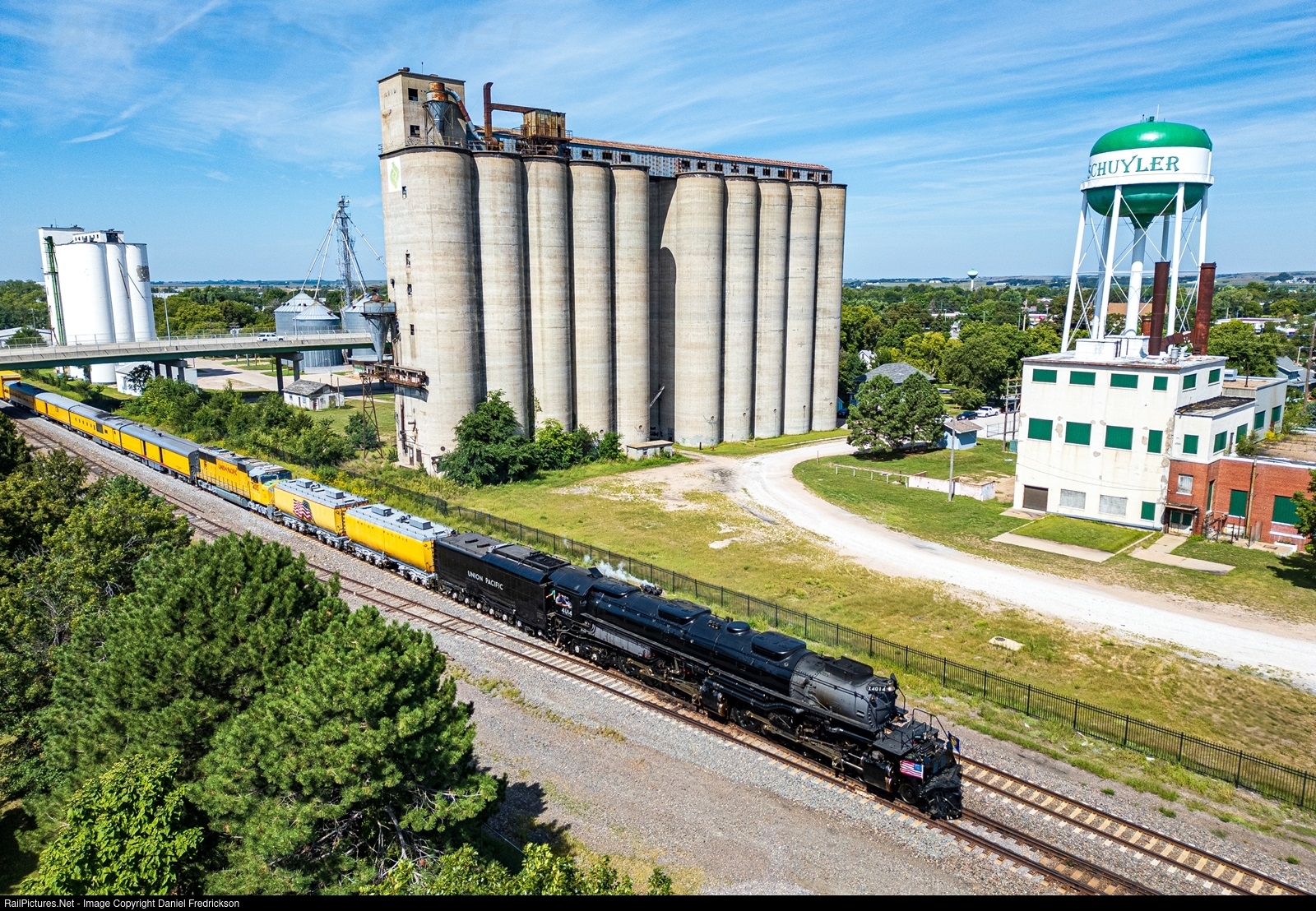 This summer, I had the privilege to witness UP 4014, Union Pacific's restored "Big Boy" 4-8-8-4 steam locomotive, ply the rails of the UP mainline once again, this time leading the "Heartland of America" tour through the states of Wyoming, Nebraska, Iowa, Illinois, Missouri, Arkansas, Texas, Oklahoma, Kansas, and Colorado. My portion of the trip consisted of traveling to Grand Island, NE and chasing it back east towards Chicagoland and eventually Momence, IL, where I gave up the chase. Here, 4014 hustles eastbound through the town of Schuyler, NE, which contains a prominent grain elevator and a water tower.