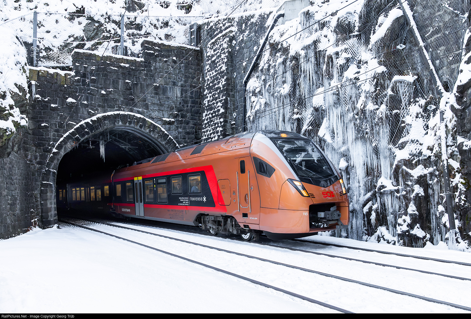 | "Traverso" train RABe 526 # 118/218 of the Südostbahn (SOB) is leaving the 78 meter long Meienkreuz tunnel in the Meienreuss gorge on the Gotthard north ramp, running the IR 2418 TRENO GOTTARDO of the line IR46 from Locarno over the Gotthard mountain line to Zürich. |