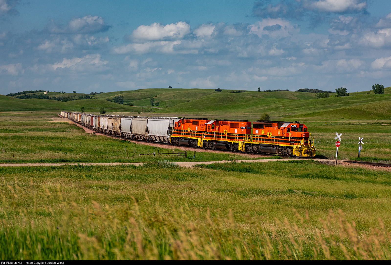 Late in the afternoon, RCPE's Mankato to Aurora train makes its way through the rolling hills of the Buffalo Ridge in Lake Benton. Though it may look like a typical summer day in this photo, the weather was soon to take a turn, as a storm was brewing to the north. Said storm produced a couple tornadoes which we saw 30 some miles away. Quite the eventful day it was.