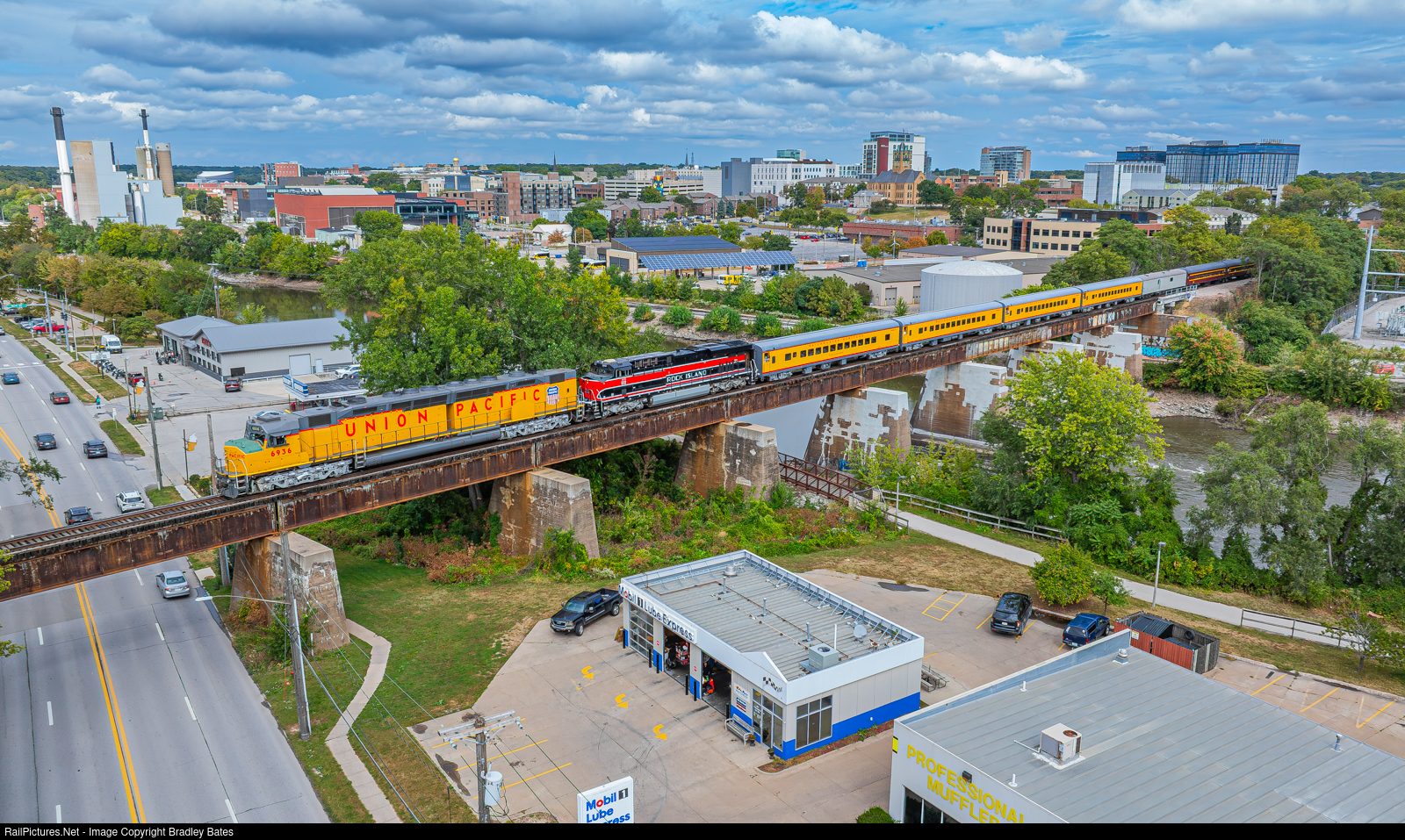 | UP DDA40X #6936 and IAIS Rock Island heritage unit #513 lead "The Quad Cities Rocket” west across the Iowa River in Iowa City, IA. This was a fundraiser trip hosted by Railroading Heritage of Midwest America (RRHMA) and the Iowa Interstate Railroad. |