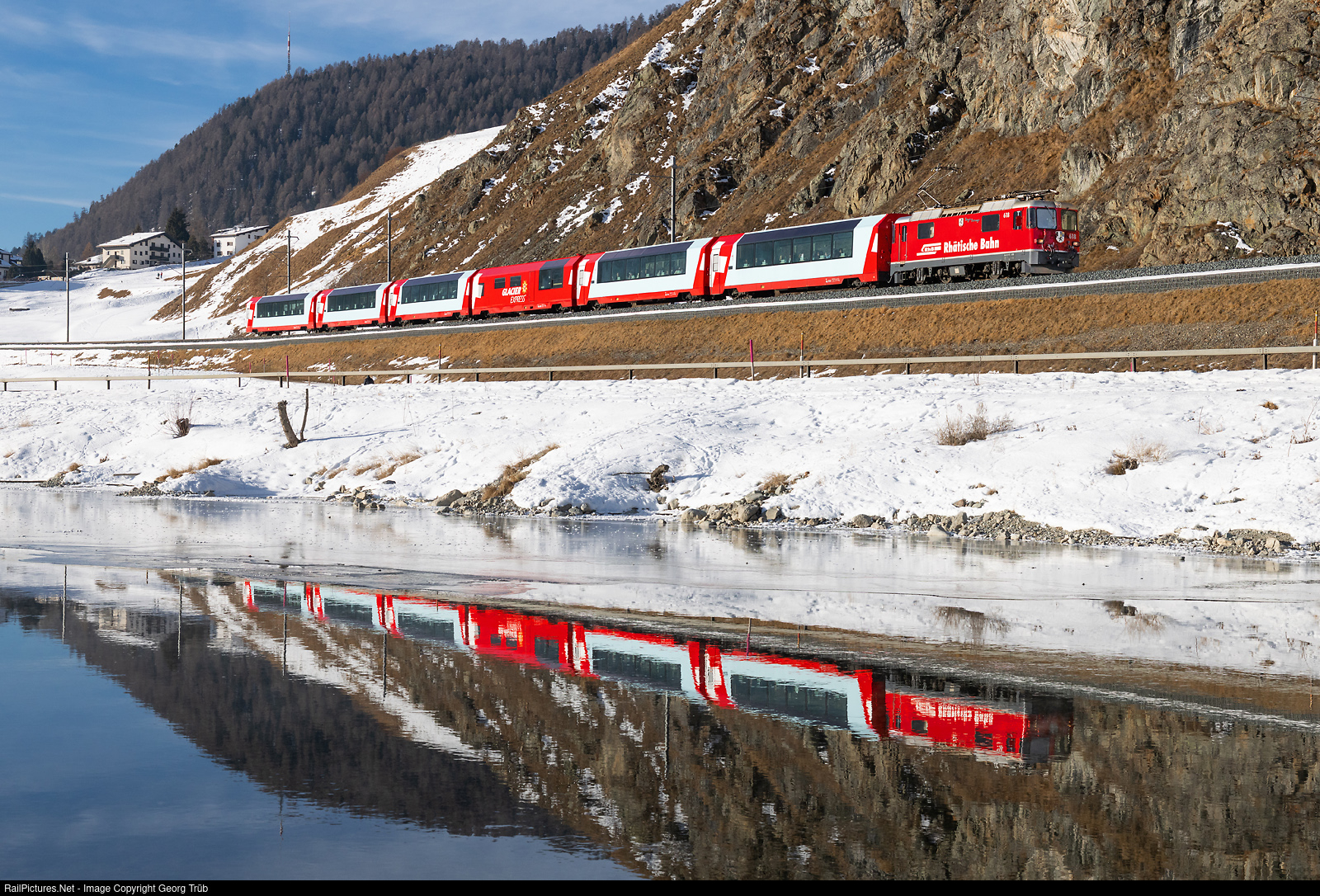 | Ge 4/4 II # 618 of the Rhaetian Railway pulls the PE 905 GLACIER EXPRESS from St.Moritz to Zermatt along the Inn river between Celerina and Samedan. |