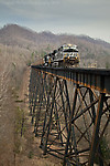 High up in the sky at Amonate, Va., No. 745 eases across the massive Trace Fork viaduct on the former Norfolk and Western Dry Fork Branch, while trekking north toward Iaeger with a train of emptie... (more)