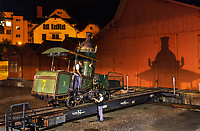 Cogwheel steamlocomotive with upright boiler, unique operational worldwide, H 1/2 # 7 of the Rigi Bahnen (owned by the Swiss Museum of Transport, Lucerne) is on the traverser of the depot Goldau, ... (more)