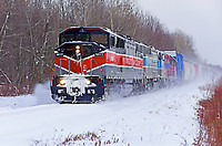 A consecutive numbered trio of ''Blue Barns'' with a leased four axles, Central Maine & Quebec Job 1 has just crossed over to the Adirondack Subdivision for the last leg of the trip to Farnham Ya... (more)