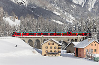 Near Cinuos-chel-Brail, the line of the Rhaetian Railway through the Engadine is crossing the river Inn on the 113 meter long and 49 meter high stone viaduct with a main span of 48 meter. Train RE... (more)