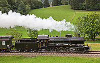 The steam train from Delémont to Reconvilier just left Court and is heading towards Sorvilier in the Jura mountain range. Pulling is the 2-10-0 "Elephant" C 5/6 # 2978 of SBB Historic, built in 1... (more)