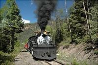 K36 487 winds down from Cumbres Pass as hit heads towards Chama with the afternoon train.