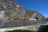 BNSF’s Denver to Laurel freight (HDENLAU) is powered by four GE units on July 10, 2021, as the train negotiates scenic Wind River Canyon just north of Dornick, Wyoming.