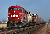 On the afternoon of November 12, 2001, a Canadian Pacific freight pulled by lone CP GE AC4400CW No. 8630, rumbles westbound through Duplainville, Wisconsin. In the 2000s, the Soo Line Railroad and... (more)