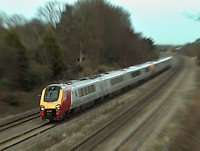 A Class 220 Voyager heads towards Reading. This shot was achieved by zooming in while taking the photo. The outer edges blur more than the middle while leaving the driver in his cab in focus